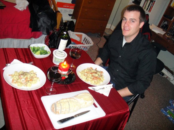 It was Tuesday, December 22, 2009. I had just returned to my apartment after my last day of work before the holidays. The Dairy Man had called from his home (an hour away) and said that he was going to drive down to make me dinner. Which, frankly, was suspicious. But I did what all girls who helped pick out their rings do—I played dumb and waited. The Dairy Man showed up with grocery bags, candles, a tablecloth, and a bottle of wine. We chatted awkwardly while he cooked up some shrimp tortellini (what I ordered on our first date) and sat down to dinner.