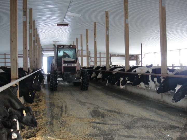 Once dinner is prepared, the tractor drives through the barns and deposits the food into the feed bunks (which, as far as I can determine, is just what we call the space on the floor directly in front of the cows).