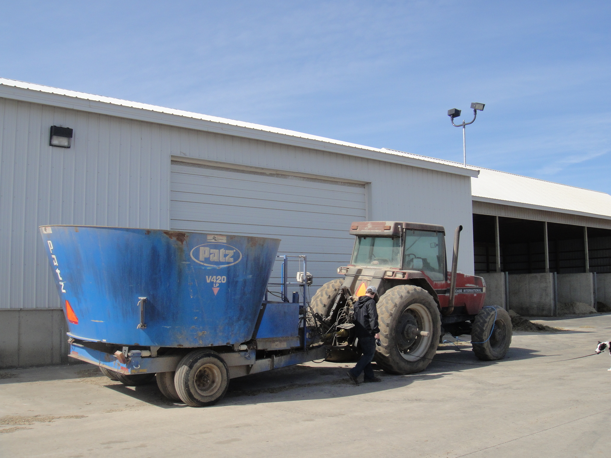 Our cows are fed once a day, typically after their first milking. While the ladies are in the parlor doing their thing, one of our employees hops into the tractor and pulls the mixer wagon (the dapper blue apparatus) to the commodities shed.