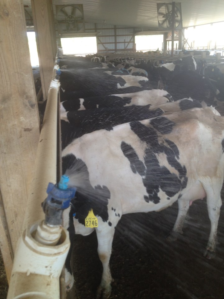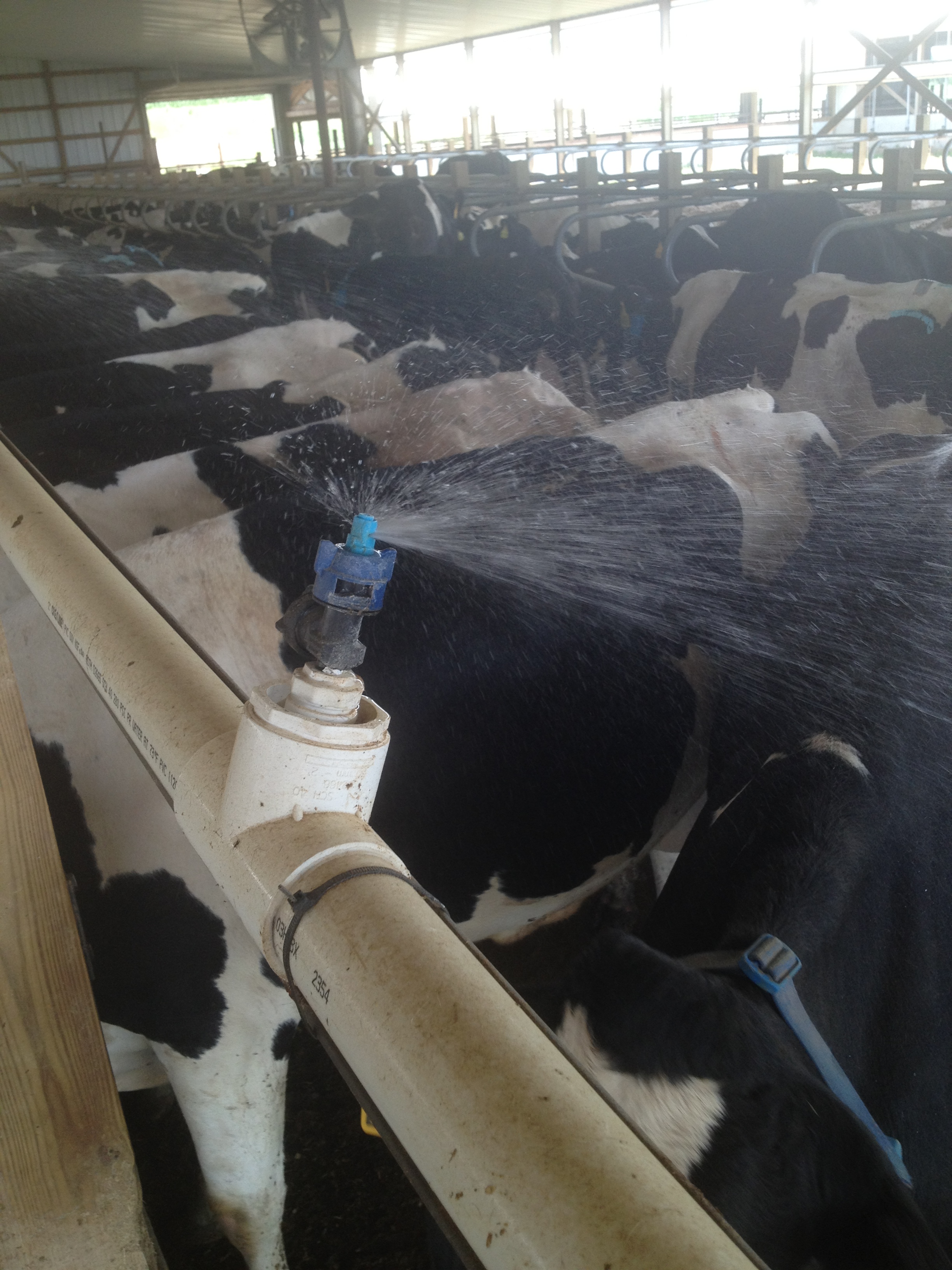 The dairy cow version of Girls Gone Wild involves sprinklers. Our sprinkler system travels the length of each barn (on both sides) and runs on a timer based on the temperature. The hotter it gets outside, the more frequently the system kicks on. The spray wets the cow to the hide and then turns off, allowing the moisture to evaporate and pull heat from her body like sweating.