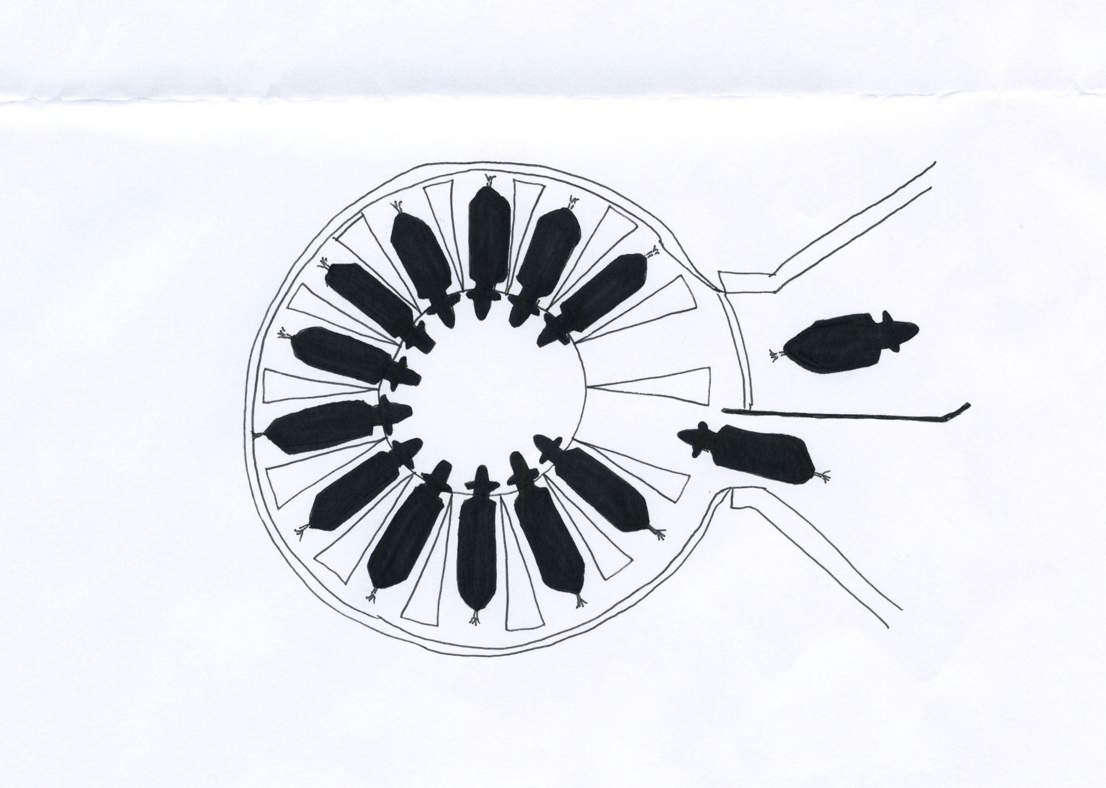 This drawing is not to scale. Most rotary parlors hold 60-80 cows at a time. But I didn’t want to draw that many cows. So you get 14.